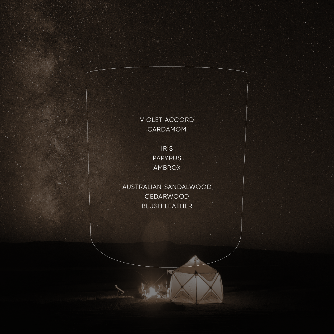 A dream beneath the stars—violet and cardamom stir the night air as iris and papyrus drift like thoughts unspoken. Sandalwood and blush leather wrap around you, soft as a desert breeze and infinite as the sky.
